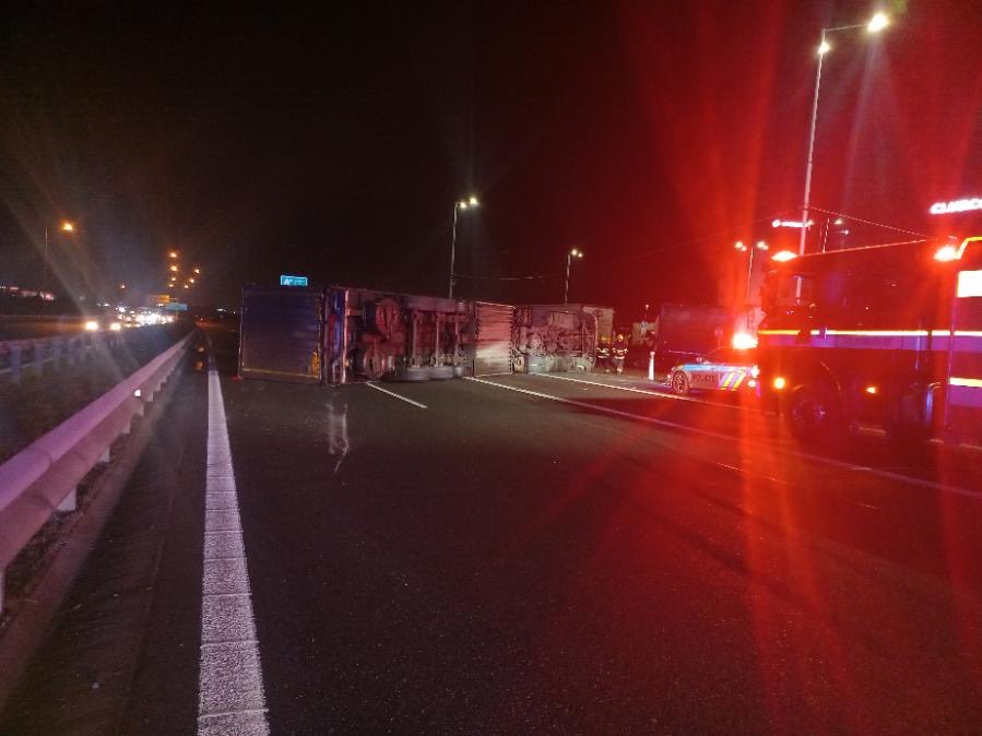 Galerie | D1 u Prahy stála: Kamion převrácen, zasahovaly záchranné složky